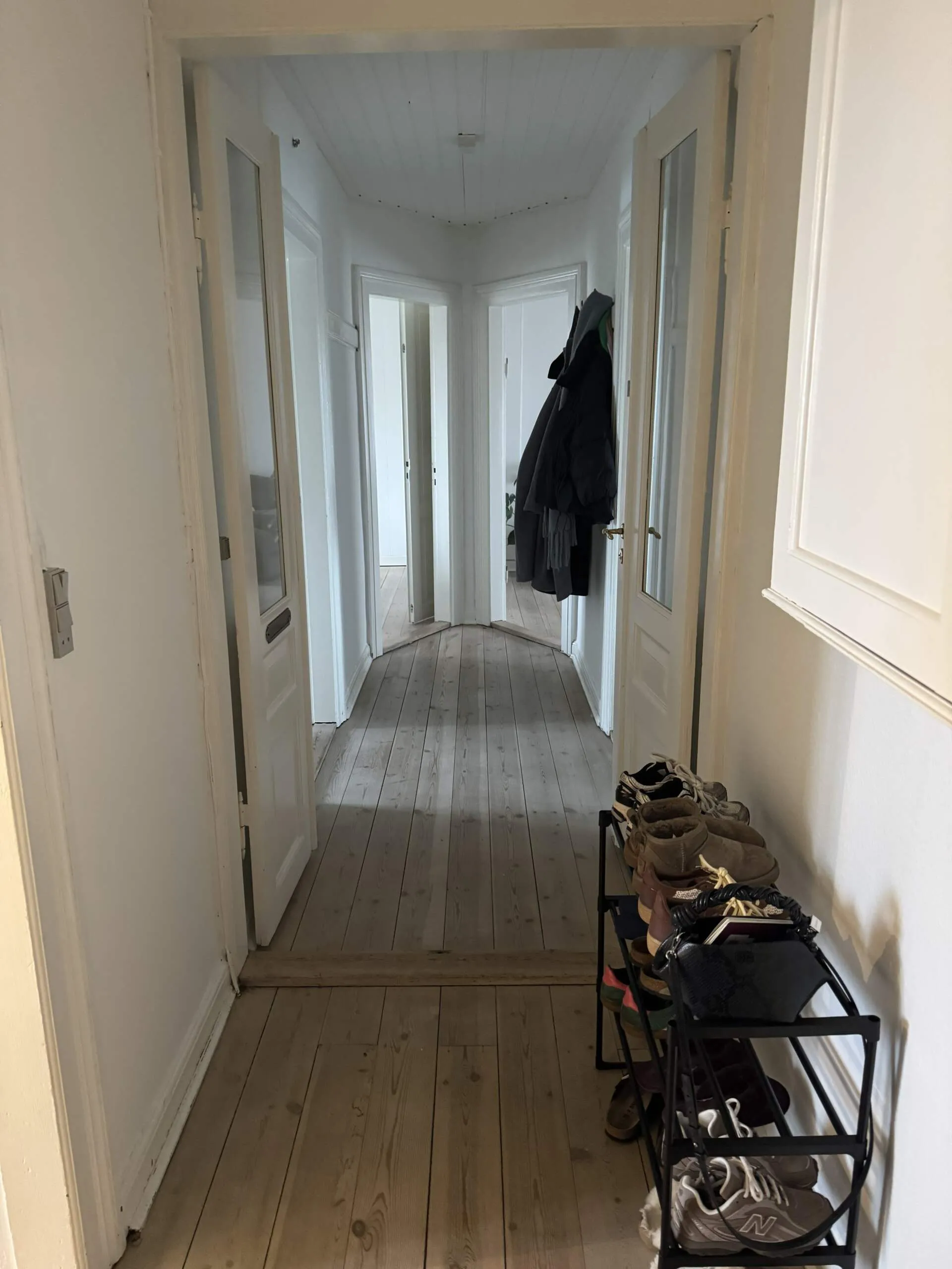 Lejligheden byder blandt andet på et stort køkken, et rummeligt badeværelse og et dejligt værelse med udgang til en lille balkon. Derudover får du et ekstra værelse, der oplagt kan bruges som kontor, walk-in eller hobbyrum, samt to skønne stuer med elegante franske døre imellem, som skaber både sammenhæng og fleksibilitet.